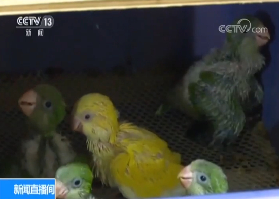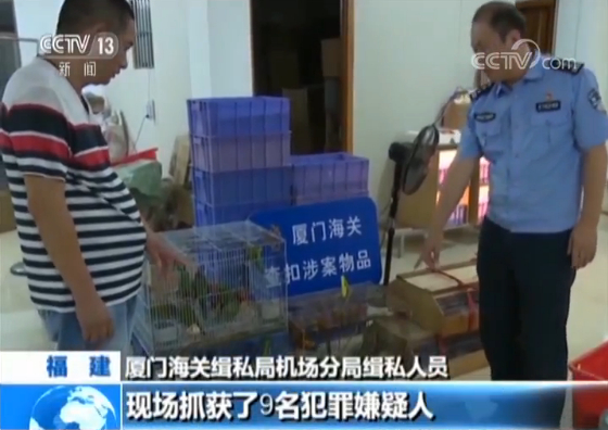 厦门海关缉私局机场分局缉私人员:现场抓获了9名犯罪嫌疑人,查扣了这个鹦鹉等珍稀的活体鸟类共395只。经过鉴定,这些鹦鹉都是属于濒危野生动植物种国际贸易公约附录二保护的品种。
