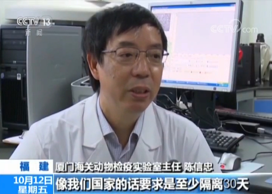 厦门海关动物检疫实验室主任 陈信忠:像我们国家的话要求是至少隔离30天,在这30天里面要做一些相关的检疫,要确认它合格了以后才能让它放行。