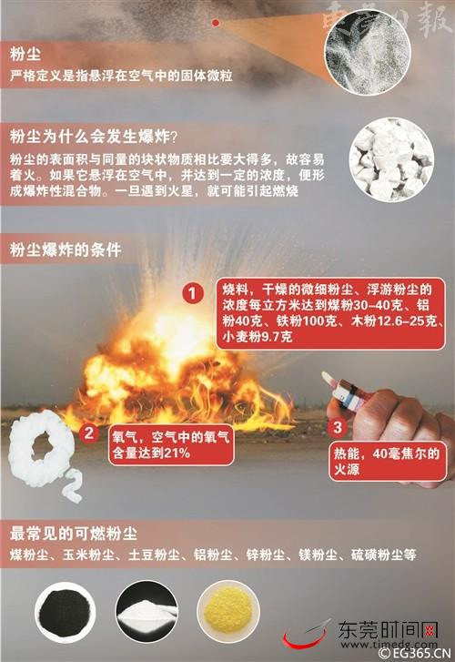 据了解,每立方米空气中含有9.7g面粉时,一旦遇有火苗、火星、电弧或适当的温度,瞬间就会燃烧起来,形成猛烈的爆炸,其威力不亚于炸弹。