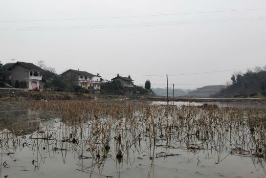 村里大片水田是原先的良田,现改种莲藕