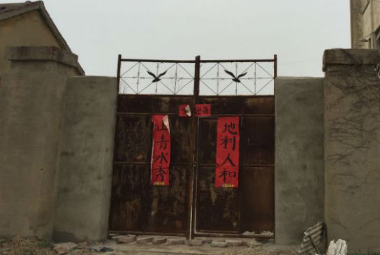 生锈的贴门上贴着一副像是刚写好不久的春联