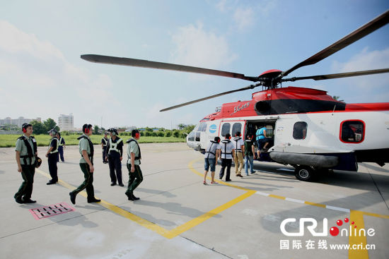 边检官兵登上直升飞机飞往南海中海油钻井平(张成斌摄)