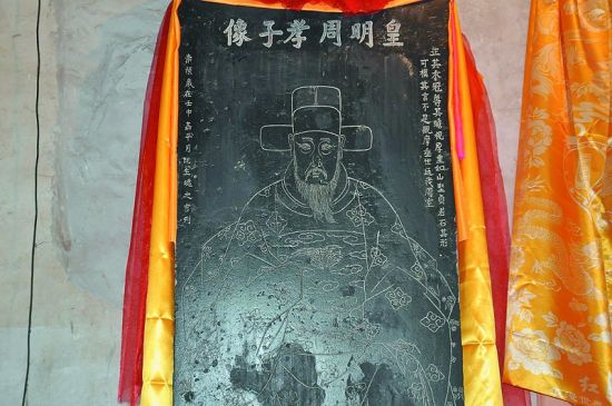 记者现场测量,正中周邦毓碑像高1.9米,宽86厘米,像碑题头为:“皇明周孝子像”,右上角刻有:“崇祯岁在壬申嘉平月既生魄之吉列”,左上角碑文记载:“正其衣冠,尊其瞻视频厚重如山坚贞若石,其形可模,其言不足观摩,垂世延我周室。”原始碑座上刻有石花云朵,刻像至今保存完好。东边碑像,碑高1.2米,宽60厘米,为周子侍侧小像。