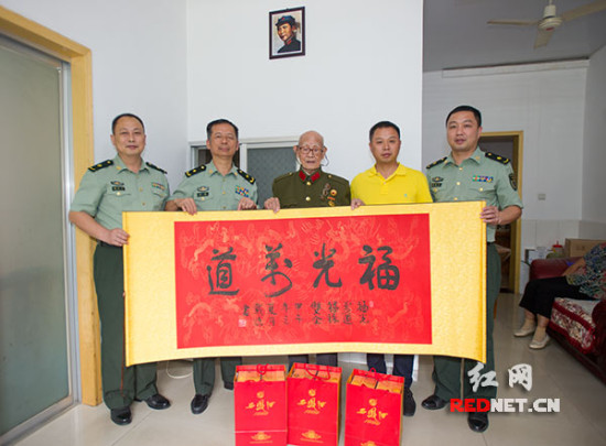 ( 8月28日,湖南省军区副司令员、军旅书法家戴焕来到老红军战士陈云忠家中,在中秋佳节来临前向他表示亲切问候。)