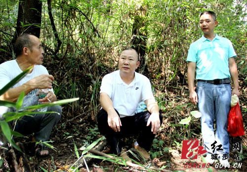 县委书记罗建南(中)听取村民(左)介绍沙角洞植被分布情况。