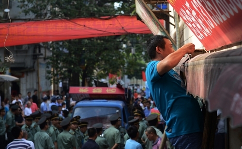 9月4日上午8点,解放四村国税局门口,天心区200多名城管、工商等部门的执法人员从这里出发,沿着四村街,由南向北进行整治。检查拆除店面外的遮阳棚、桌椅、厨具等违规搭建、占道的物品,清理脏乱差的马路环境。