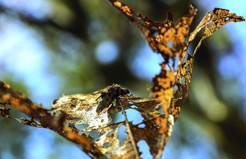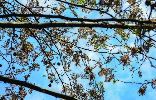 上午10点,在曙光南路长沙卷烟厂附近,路边梧桐树的树叶被虫子啃食空,只剩下梧桐叶的经脉挂在树枝上,原本应该繁茂浓密的梧桐树,树叶变得稀稀落落。