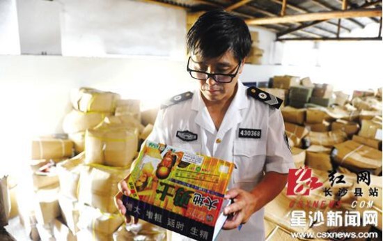 去年7月18日,长沙县公安局治安大队联合县食药监局在湘龙街道土桥村一民房内查获一制造假性药窝点,现场收缴标识为香港天龙生物科技有限公司生产的“天下第一棒”、“黑蚂蚁生精片”等19个品种的性保健品280余件及生产工具一批,并在现场抓获生产工人3名。