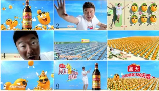 晒真的、晒大的、晒久的——是海天酱油“晒”高一筹的关键。在创意中,汪涵与海天酱油的御用代言人——海天欢乐豆一起晒太阳,欢乐互动,蓝天白云,灿烂阳光的美好画面,把海天酱油“天然、健康、轻松、高品质”的品牌形象很好的传达出来。