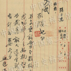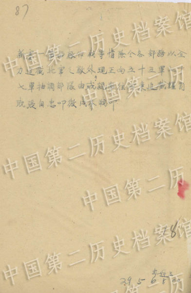 1940年5月7日,蒋介石指示战机致第三十三集团军总司令张自忠电稿(中国第二历史档案馆提供)