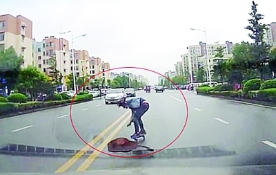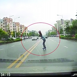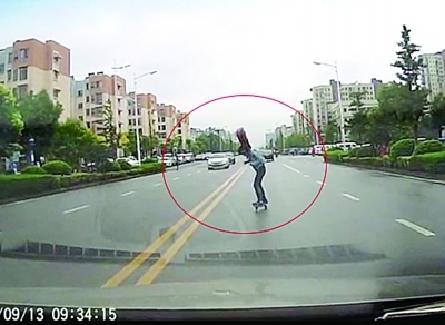 女子玩滑板碰瓷被行车记录仪拍摄全程(组图)