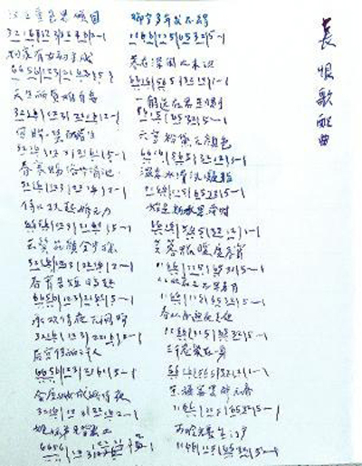 中秋节那天,老人又想起这件事,他在病房的选餐纸上用蝇头小字密密麻麻默写下了全篇的《长恨歌》以及曲调的简谱,并吃力地再一次唱给该网友听。“我不认识从事音乐的朋友,所以发微博,希望有古风翻唱圈的大神能帮帮我。”