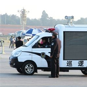 国庆节将至,昨日,天安门广场增设新型巡逻车。该车配有远射灯、显示大屏、车顶摄像头等设备。图/CFP
