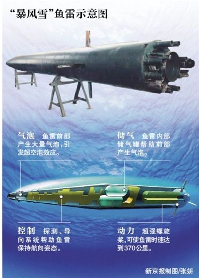 海军军事学术研究所研究员张军社对新京报记者表示,“暴风雪”鱼雷航行速度可达每小时370公里,比传统鱼雷高出三四倍,超空泡鱼雷能很快击中目标,目标很难躲避。