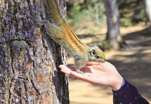 游客在挑逗一只松鼠■华商晨报 华商响网记者 邢子慕 摄