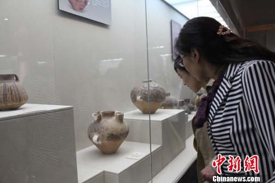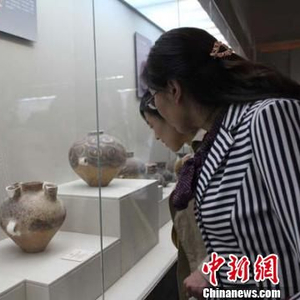 9月23日,甘肃临夏州举行了中国马家窑文化彩陶研究会揭牌仪式,并展出了上千件精美的彩陶藏品。图为精美彩陶吸引市民驻足观赏。 徐雪 摄