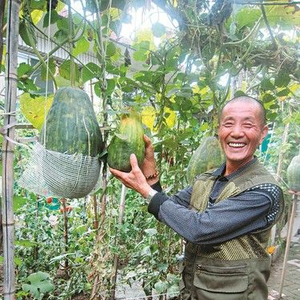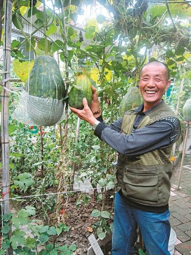牛文会家的小院里,有一个由南瓜藤蔓“搭”成的小凉亭,藤的分支上零散地结着个头较大的绿皮南瓜。因为个头大,多数南瓜都用一个网兜兜住,挂在搭建的木棍上,藤蔓分支较长的,一根木棍上放一块小木板支撑着瓜,以防止藤蔓支撑不住断掉。记者粗略数了一下,上面一共结着24个南瓜。“前几天掉下来三四个。”牛文会说,藤蔓最前端结的几个掉下来后,他赶紧用网兜把它们兜住,“现在南瓜还有些嫩,还得再长长。”在牛文会的指引下,记者见到了那根独苗南瓜藤,藤蔓约有黄瓜粗细,有两个较大的分支。