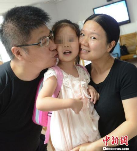 9月23日,康复出院的3岁美籍华裔女童李祖儿与父母相拥,乐融融。 刘可耕 摄