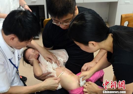 福建医科大学附属第一医院小儿外科主任李笃妙与康复出院的3岁美籍华裔女童李祖儿的父母,共同为小祖儿痊愈的肚皮皮肤进行清洁。 刘可耕 摄