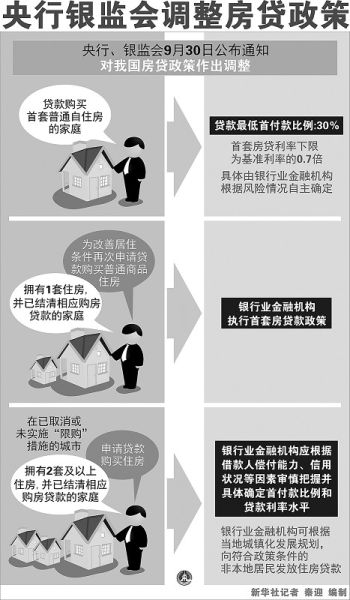 据新华社电 央行、银监会9月30日公布通知,对我国房贷政策作出调整,其中对拥有1套住房并已结清相应购房贷款的家庭,为改善居住条件再次申请贷款购买普通商品住房,执行首套房贷款政策;首套房贷利率下限为基准利率的0.7倍。