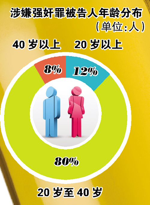 据海珠区法院统计,2012年至2014年10月97个涉嫌强奸罪的被告人中,20岁以下12人,占12.4%,20岁至40岁77人,占79.4%,40岁以上8人,占8.2%。高中以上文化程度31人,占32.0%,其中本科、专科23人;初中、小学、文盲66人,占68.0%。