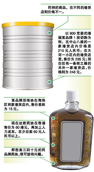 同样的商品,在不同的港货店则价格不一。以900克装的港版某品牌1段奶粉为例,在中山八路的一家港货店内价格是210元人民币;在天河一小区内的港货店里,售价为235元;而仅有一条街之隔的另外一家店名为“港行”的店里,价格则为248元。