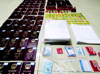 图为警方缴获的部分用于骗取签证的伪假材料。本报记者 韩宇 摄