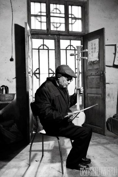 瞎子艺人郭永章坐在公园凉亭里,肤色黝黑,身着白褂,戴着大墨镜,弦子拉得前仰后合,他朝天咧着大嘴,用破锣般的嗓子吼着:“袁世凯他给我种过地,宣统他给我掌过大鞭,冯玉祥他给我当伙计,张天师他给我看菜园嘞,王母娘娘来做饭,九天仙女当丫鬟,孔老二他给我管过账,蒋介石他黑间半夜里给我夜壶掂。”在他的周围,一群老年人听得津津有味。