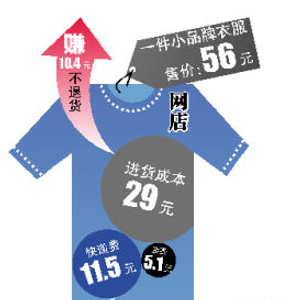 而同样是这件衣服,记者致电网店店主了解到,进货成本是29元,从杭州寄到广州快递费(含批量优惠)11.5元,人工、水电等杂费共计5.1元。在不退货的情况下,卖一件能赚10.4元。而一旦因质量问题须承担退货,这件衣服不但不赚,反而还赔4.6元。