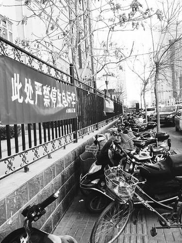 1月4日,记者在太原市坞城北街长治路口处看到,在严禁停放自行车的宣传标语下,电动车、自行车依然密密麻麻的停放在人行道上。据附近居民反应,此处经常因为各类交通工具随意停放而导致道路堵塞,希望有关部门能尽快出台相关措施,保持道路畅通。