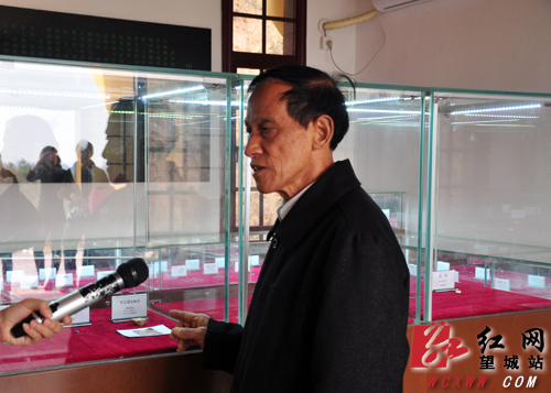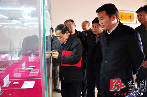 望城区政协主席(右)骆志平参观古钱币。(刘赛 摄)