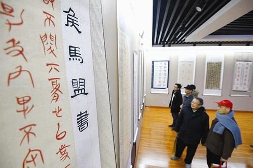 1月6日,山西美术馆展厅,书法爱好者正在欣赏“侯马盟书体”作品。“侯马盟书”是1965年在侯马晋国遗址出土的一系列盟誓辞文玉石片,记载了 “三家分晋”之前晋国一系列政治斗争,是我国目前所发现古代文字中最早用毛笔书写且篇章完整的官方典籍书法真迹,属大篆体系。