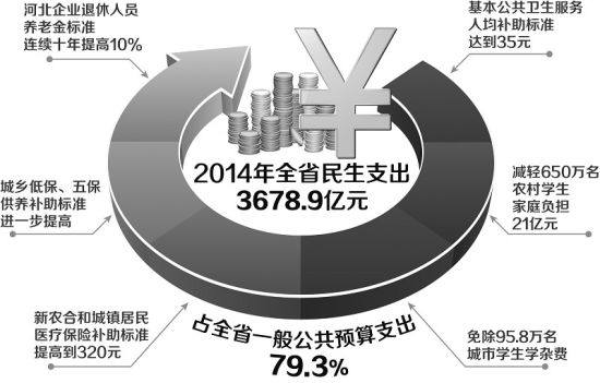 2014年,河北企业退休人员养老金标准连续十年提高10%,城乡低保、五保供养补助的标准进一步提高,新农合和城镇居民医疗保险补助标准提高到320元,基本公共卫生服务人均补助标准达到35元,减轻650万名农村学生家庭负担21亿元,免除95.8万名城市学生学杂费……