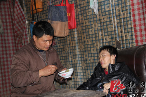 红网城步站1月9日讯(分站记者 肖丁勤 通讯员 刘长爱)妻子瘫痪15年,只有眼球能转动,全身身体畸形、肌肉萎缩、关节僵硬,体重不到25公斤,一天不喂药就会自然死亡;丈夫高大帅气,每天伺药喂饭,悉心照料,每小时为她翻次身,两小时为她端次尿,四小时喂一次药,用博大的爱心与坚毅的信念延续着妻子脆弱的生命。