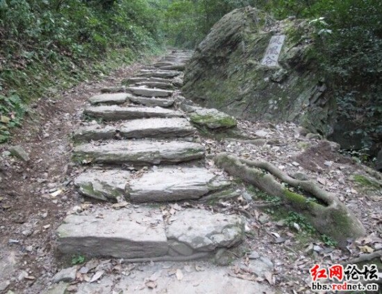 (岐山古道狭窄扬长,路面怪石嶙峋。)