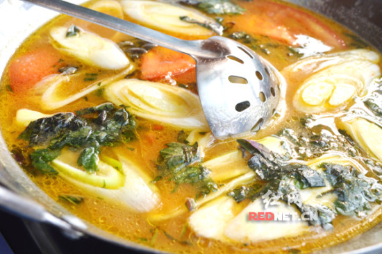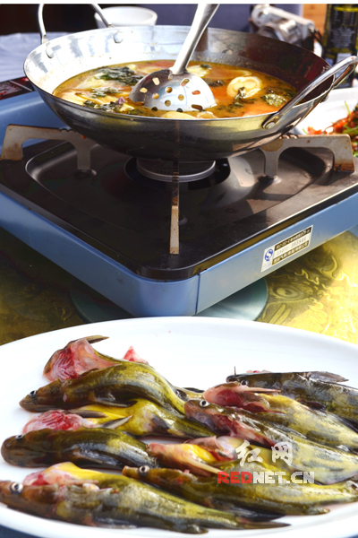烫锅黄鸭叫,锅底是用鸡汤特别调制的,用很多人大爱的山胡椒油,还有西红柿,选用的是现杀的比较小个的黄鸭叫,放进烫锅中煮一两分钟夹出来吃最好,鱼肉鲜美还有淡淡的山胡椒油香和西红柿的清爽口感。