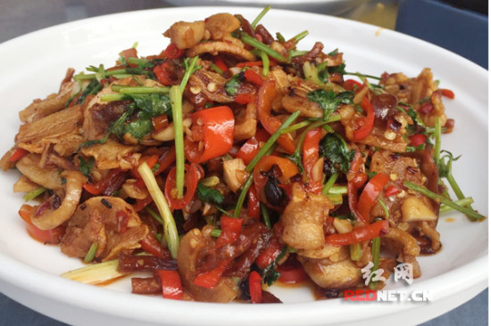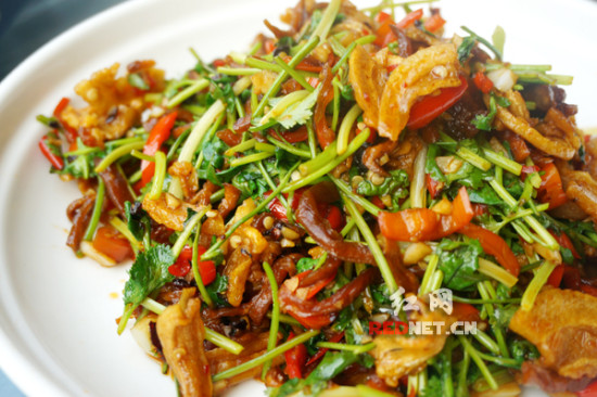 爽口油渣是绝对的下饭菜,与常见的青椒炒油炸不同的是,这里的油渣是用红椒、香菜和木瓜条放豆豉一起炒成的,油渣香脆,木瓜条脆而爽口解了油炸的腻,非常下饭。