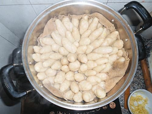 3、搓土豆丸子时,搓成细长形,在笼屉里立着一圈圈摆放,搓好一个,往里立一个,这样能节省空间。