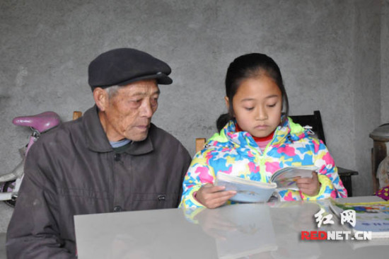 (钟江武生前一直帮扶的孤儿赵春凤[右]在认真看书。)