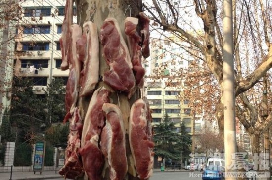1月21日,曙光中路,一棵法国梧桐上钉了很多钉子,挂满了腊肉。图/潇湘晨报记者刘志杰