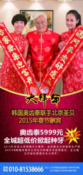 本月初,韩国奥齿泰与北京圣贝联手以为顾客拜年的方式降低种植体价格惠泽顾客。 “百度”显示:奥齿泰是世界排名第五的种植体,韩国人异常喜欢的种植体品牌。而北京圣贝是目前市场上表现活跃的牙科品牌,尤其以与德国弗莱堡大学口腔分院合作研发的PRUSSIAN种植系统闻名京城。并且在全国拥有以PRUSSIAN种植牙和PRUSSIAN5D亲贝美齿技术为核心的8家牙科会所。