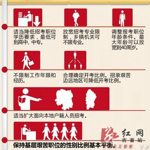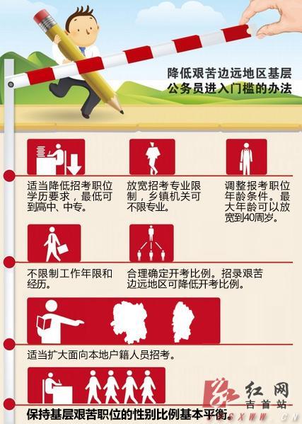 红网吉首站1月23日讯(分站记者 肖庆宾)省委组织部、省人社厅、省公务员局日前发布《关于做好艰苦边远地区基层公务员考试录用工作的实施意见》,规定基层公务员降低进入门槛政策的区域范围、政策措施,并明确将拓宽考录范围和来源渠道,严格规范基层公务员考录工作。吉首市适用上述政策区域范围。
