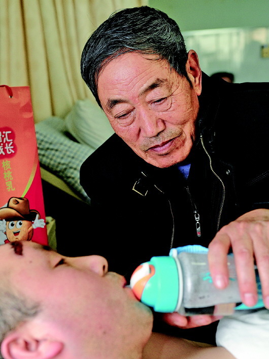 ▲李长河照顾李金盘细致入微。本报记者 周青先 摄