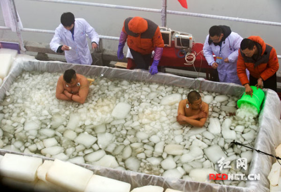 21岁的江西妹子刘喻芬显然被飘满冰块的冰池吓到。由于比赛规定选手必须在进入冰水后坐下或蹲下,她只能一边哭喊“不要”边咬牙坚持,体验了一次非同寻常的耐寒经历。