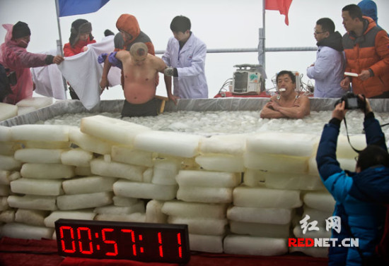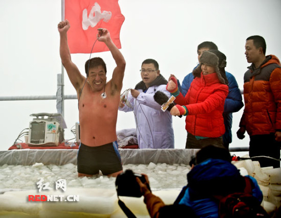红网张家界1月25日讯(时刻新闻记者 姚冶 摄影 明健飞)1月25日下午,“2015天门山冰水耐寒大挑战”在张家界天门山最高峰云梦仙顶落幕。