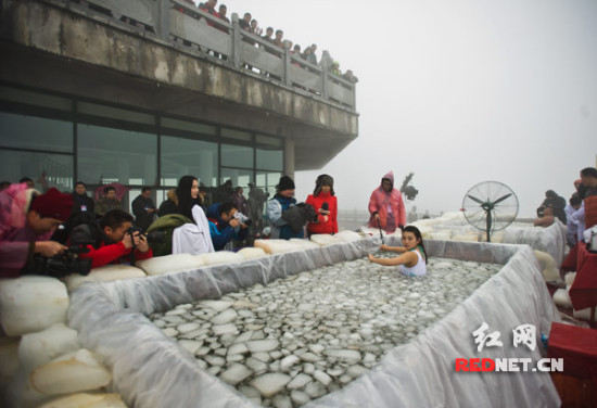 (1月25日下午,2015“冰水耐寒大挑战”继续在张家界天门山海拔1518米的最高峰进行。)