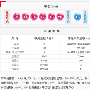 中彩网讯 1月25日晚,中国福利彩票双色球游戏进行第2015011期开奖。这是双色球5亿元大派奖最后一期,当期双色球头奖开出5注,单注奖金为1200万元(含派奖200万元);二等奖开出100注,单注金额36万多元。幸运二等奖4注,单注金额161多万元(含派奖125万元)。计奖后,奖池金额为7.1亿多元。