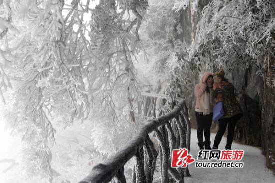 (面对天门山梦幻般雪景,游客纷纷驻足留影。)
