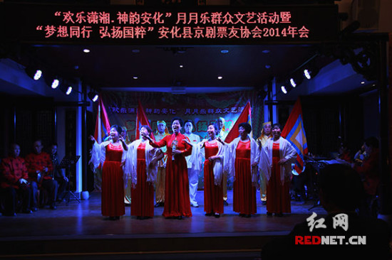 红网安化2月1日讯(通讯员 贺迪清)1月30日晚,湖南省安化县委宣传部、县文联、县京剧票友协会在县城阿香美中国安化黑茶文化传播中心举行“欢乐潇湘·神韵安化”月月乐群众文艺活动暨“梦想同行·弘扬国粹”安化县京剧票友协会2014年会,全县京剧爱好者和市民欢聚一堂,共享文化盛宴。