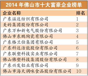 广州日报讯 (文、表/记者张婷婷)专利是企业创新能力的展示,佛山去年的创新能力如何,有哪些企业脱颖而出?佛山市知识产权协会上周五晚公布2014年度十大专利富豪榜,广东溢达纺织有限公司超越“前首富”美的集团,夺得2014年佛山十大专利富豪魁首。